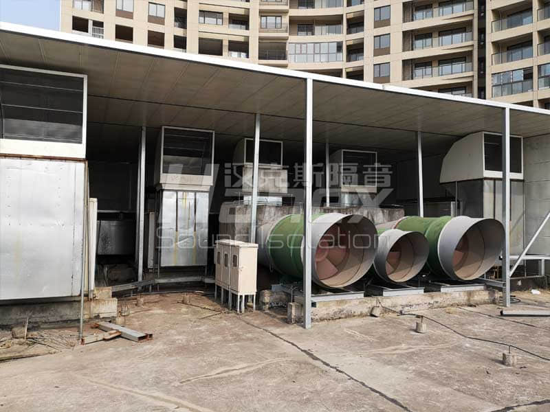 1、經過漢克斯隔音技術人員現場踏勘及結合業主所提供的資料,裙房屋面西北角有P4~P8排油煙風機房,保證其工作運行時產生的噪聲不往外擴散,對P4~P8排油煙風機進行整體安裝隔聲罩。