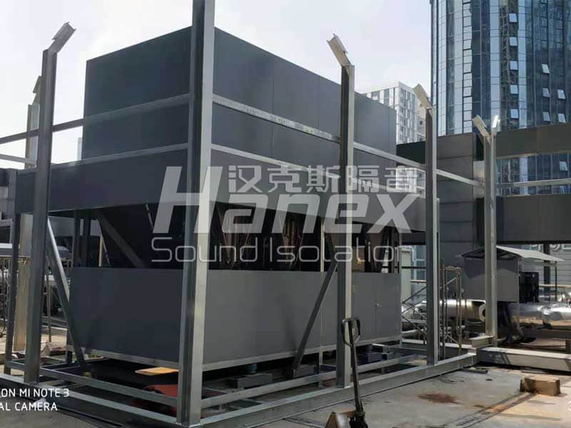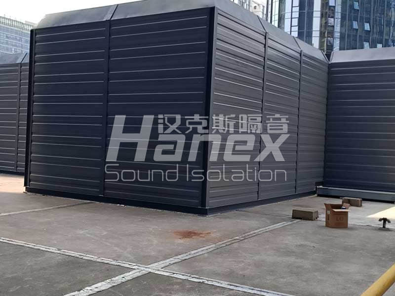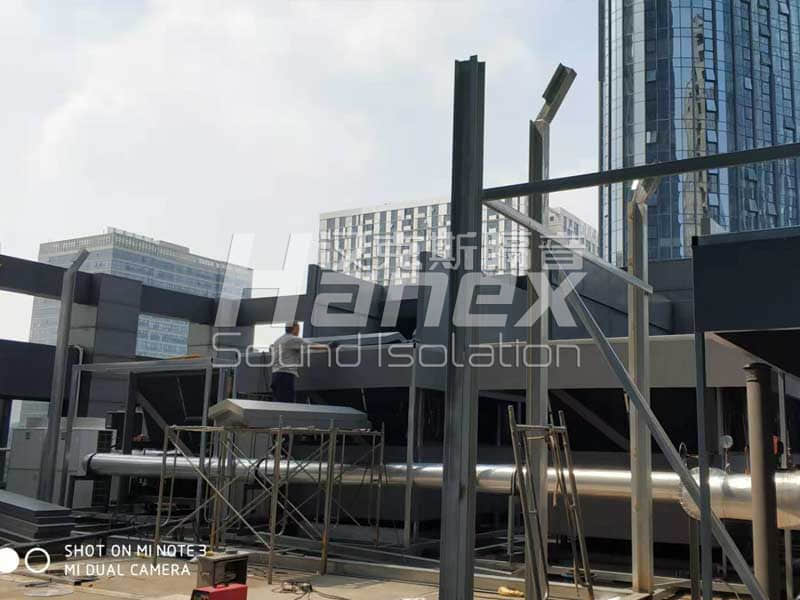 3、根據現場實際情況,空調機組底部的壓縮機周圍無阻擋,我司技術人員發現壓縮機工作運行時所產生的噪聲往外擴散,影響其周邊環境。因此,我司技術人員結合以往同類項目案例經驗,采用隔音板對空調機組底部壓縮機四周進行圍擋,控制其工作產生的噪聲往外擴散。同時從空調機組頂部做500mm隔聲掛板,防止壓縮機產生的噪聲從頂部溢出擴散到周圍環境。